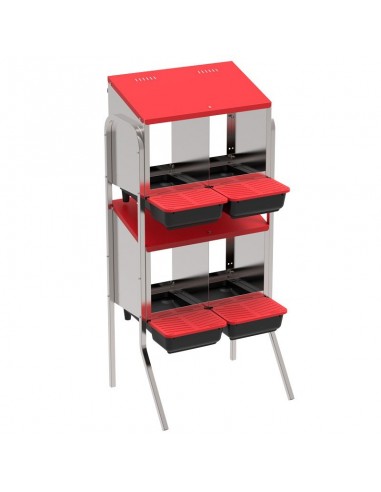 El modulo de ponederos para gallinas esta elaborado con chapa lacada para una máxima durabilidad en exteriores y sus bandejas en plástico de alta resistencia garantizan la protección y limpieza de los huevos que pueden ser recolectados fácilmente levantando la tapa protectora.