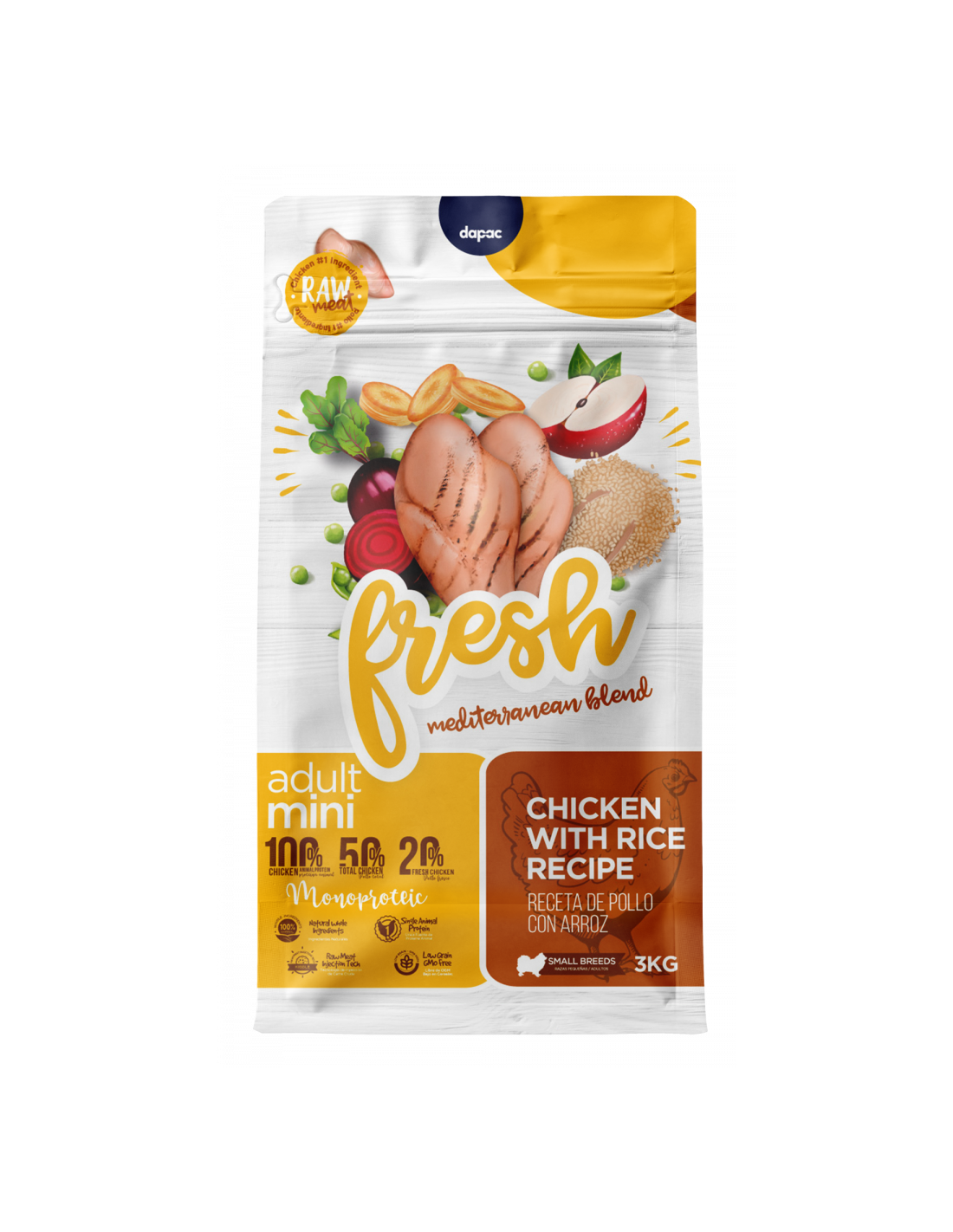 Adult Mini Fresh Mediterranean Blend está especialmente formulada para perros en edad adulta y de raza pequeña o mini. La receta incluye verdadero pollo, ingredientes naturales y el tamaño de la croqueta se adapta a la morfología de este tipo de raza de perro mini, es decir que Fresh Adult Mini es perfecto para mandíbulas pequeñas. Sus principales ingredientes son pollo deshidratado, pollo fresco 20%, arroz entero y guisantes.