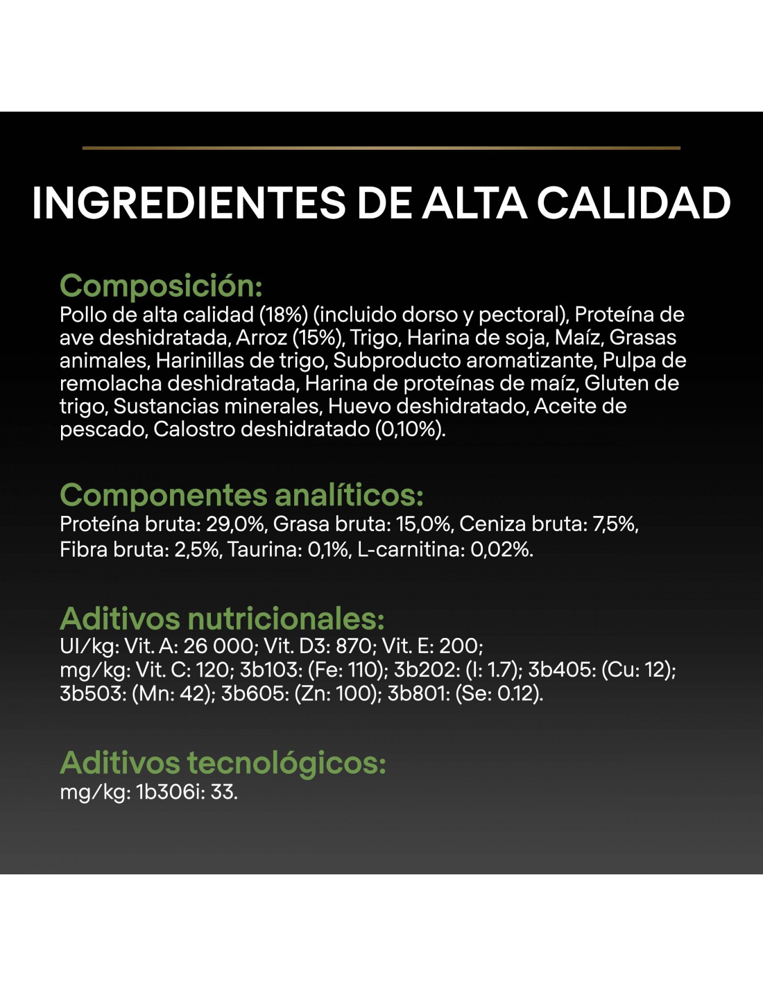 Pollo de alta calidad (18% - incluido dorso y pectoral), Proteína de ave deshidratada, Arroz (15%), Trigo, Harina de soja, Maíz, Grasas animales, Harinillas de trigo, Subproducto aromatizante, Pulpa de remolacha deshidratada, Harina de proteínas de maíz, Gluten de trigo, Sustancias minerales, Huevo deshidratado, Aceite de pescado, Calostro deshidratado (0,1%).