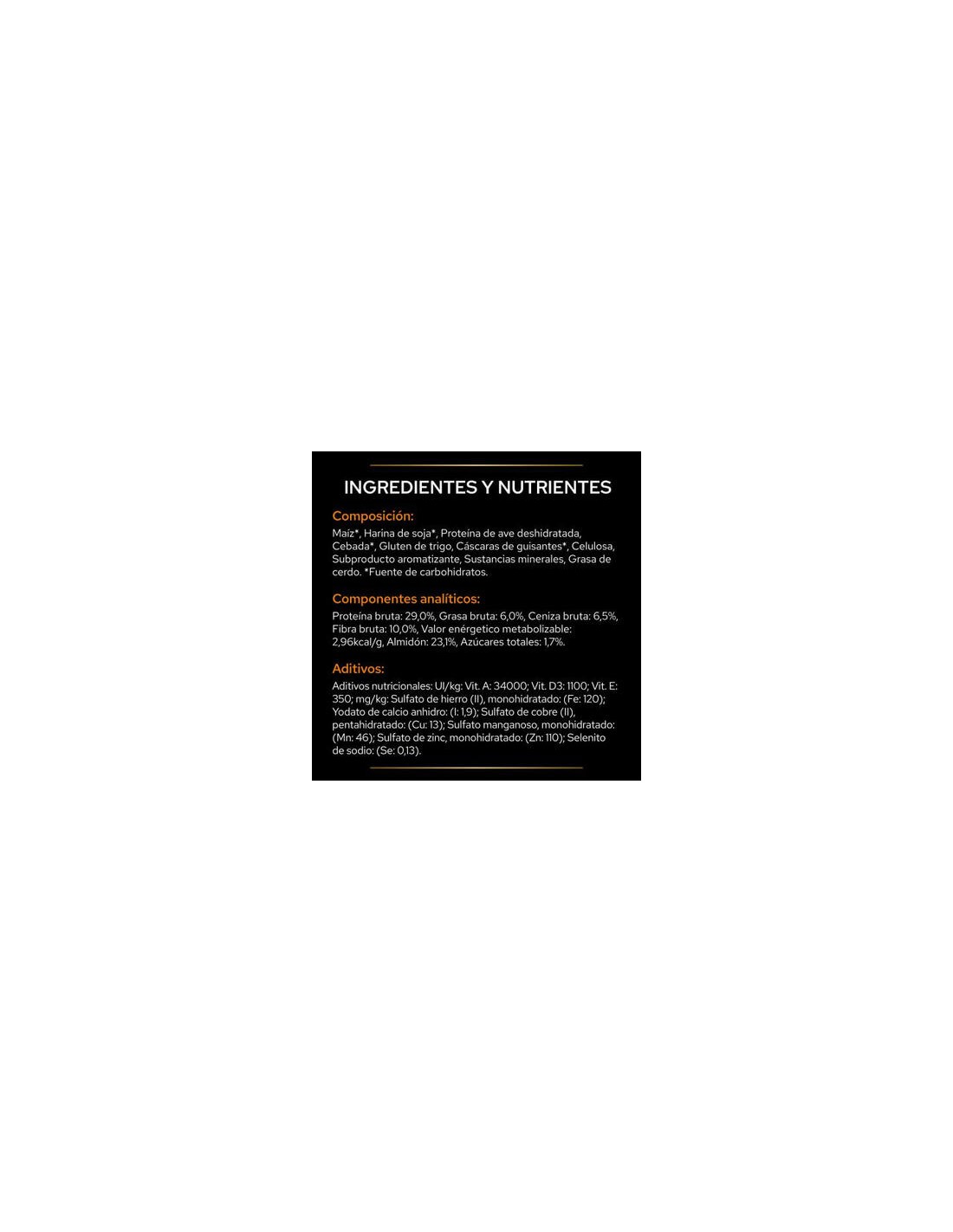 - Ingredientes: harina de maíz, harina de gluten de maíz, harina de soja, fibra de guisantes, cebada, harina de gluten de trigo, proteínas de ave deshidratadas, subproducto aromatizante, sustancias minerales, grasa animal.