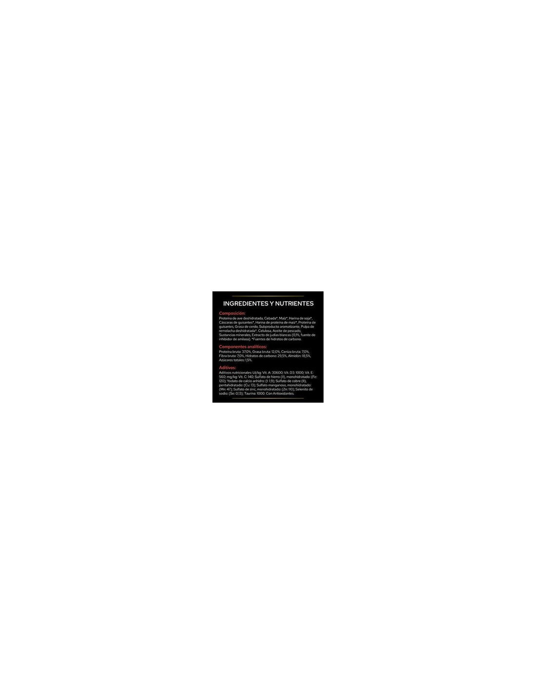 Proteínas de ave deshidratadas, cebada*, harina de gluten de maíz, maíz*, harina de soja*, fibras de guisantes*,