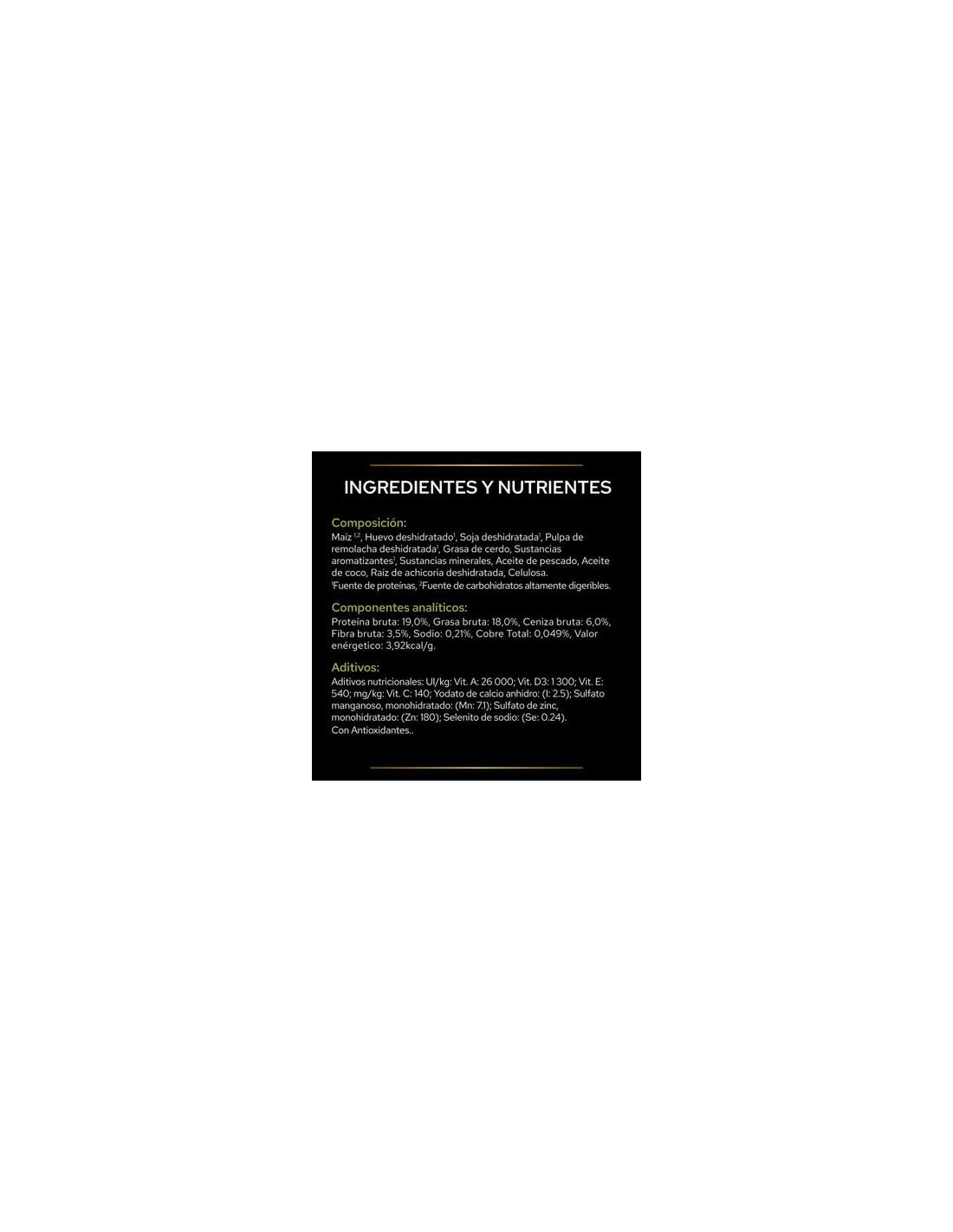 Formulada con un nivel moderado de proteínas (19 %), proporciona los aminoácidos necesarios para evitar el catabolismo sin aumentar el riesgo de encefalopatía hepática. Las fuentes de proteína son soja, maíz, huevo y pulpa de remolacha (62 % vegetales y 33 % huevo) para reducir la acumulación de toxinas y mantener la función hepática.