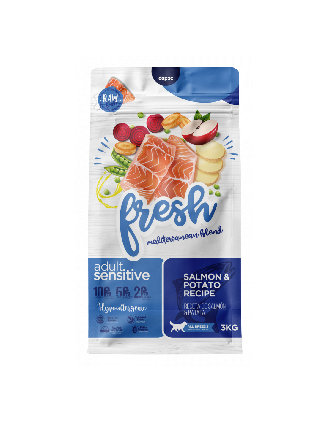 Salmon deshidratado 25%, carne fresca de salmon 20%, patata 18%, arroz, trigo, maíz, grasa de ave, hidrolizado de salmon, guisantes 3,0%, pulpa de remolacha 1,5%, levaduras 1% (fuente de MOS), zahahoria deshidratada 0,5%, manzana deshidratada 0,5%, aceite de oliva 0,3%, inulina (FOS) 0,2%.