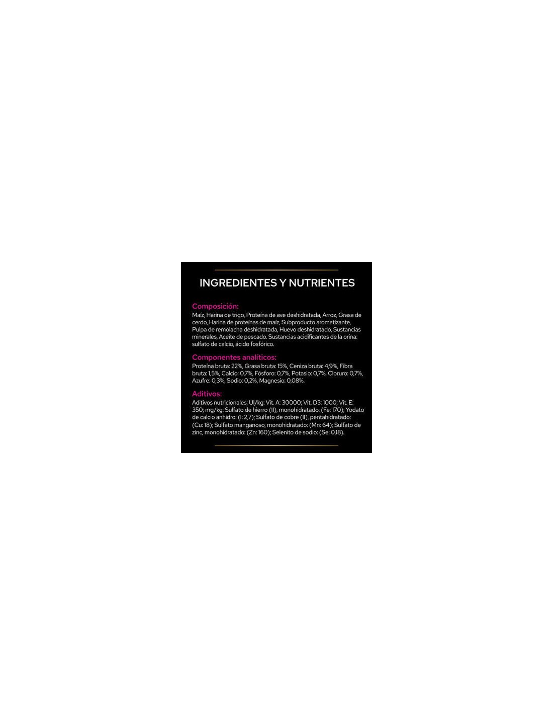 • Ingredientes: harina de maíz, harina de gluten de maíz, harina de arroz, proteínas de ave deshidratadas, harina de trigo, grasa animal, subproducto aromatizante, pulpa de remolacha deshidratada, sustancias minerales, huevo deshidratado, aceite de pescado. Sustancia acidificante de la orina: sulfato de calcio.