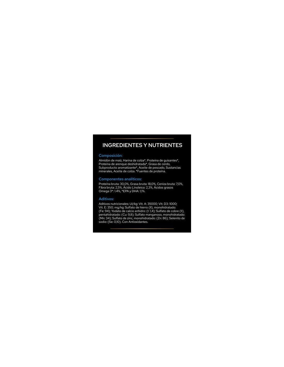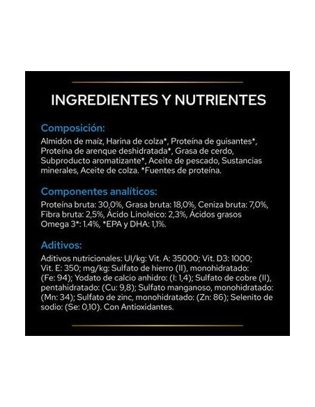 • Ingredientes: almidón de maíz, harina de colza, concentrado de proteínas de guisantes, proteínas de arenque deshidratadas, grasa animal, subproducto aromatizante, aceite de pescado, aceite de colza, sustancias minerales.