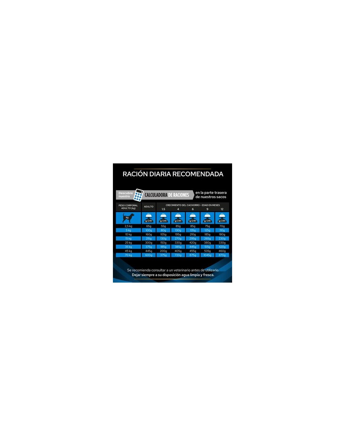 • Composición analítica: humedad 7.5%, proteína bruta 30% (arginina 2.0%, lisina 2.0%, glicina 1.7%, prolina 1.5%), materias grasas brutas 18%, ácidos grasos omega 3 1.5% (EPA 0.7%, DHA 0.5%), ácidos grasos omega 6 2.3%, ácido linoleico 2%, hidratos de carbono 35%, zinc 270 mg/kg, vitamina A (20000 UI/kg), vitamina E (300 mg/kg), vitamina C (80 mg/kg), vitaminas B (riboflavinas B2 16 mg/kg, niacina B3 170 mg/kg, ácido pantoténico B5 51 mg/kg, piridoxina B6 13 mg/kg, biotina B8 0.3 mg/kg, ácido fólico B9 4 mg/kg, cobalamina B12 0.22% mg/kg).